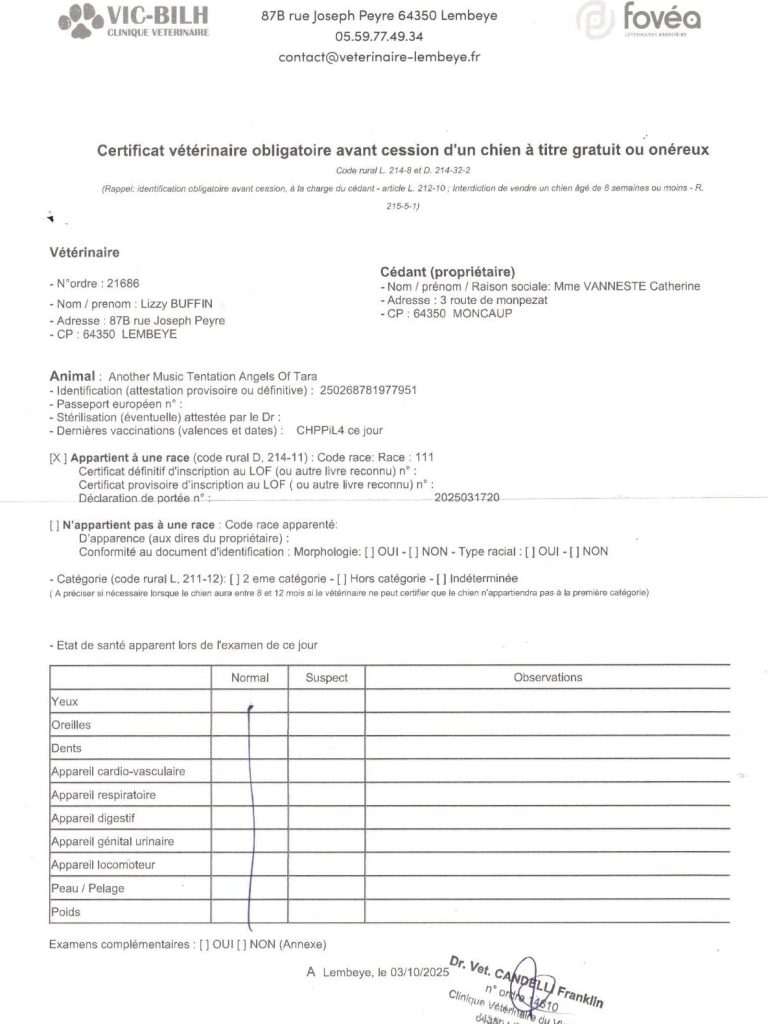 Santé : Il partira castré, à jour de ses vaccins, vermifugé et traité (puces/tiques). Une séance d'ostéopathie de croissance a déjà été réalisée.